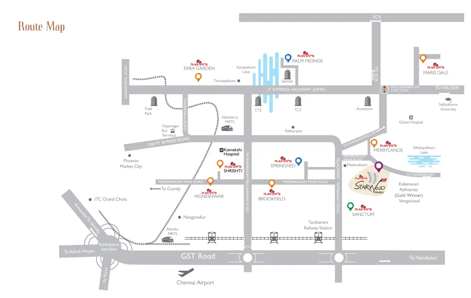 Welcome to a blissful living at Navin’s Starwood Towers 3.0. Just 15 minutes from Velachery, this community offers an upscale lifestyle loaded with conveniences, leisure indulgences and world class amenities with acres of greenery around. Spread across 9.85 acres of serenity and calmness Navin’s Starwood Towers is set at the confluence of Velachery, Sholingnallur (OMR) & Tambaram. Schools, Colleges, Hospitals, IT parks and Malls are a short drive away. Navin’s Starwood Towers 3.0 is built on basement+ stilt + 21 floors comprising 588 elegantly designed 2 BHK homes across two towers Maple & Cedar.